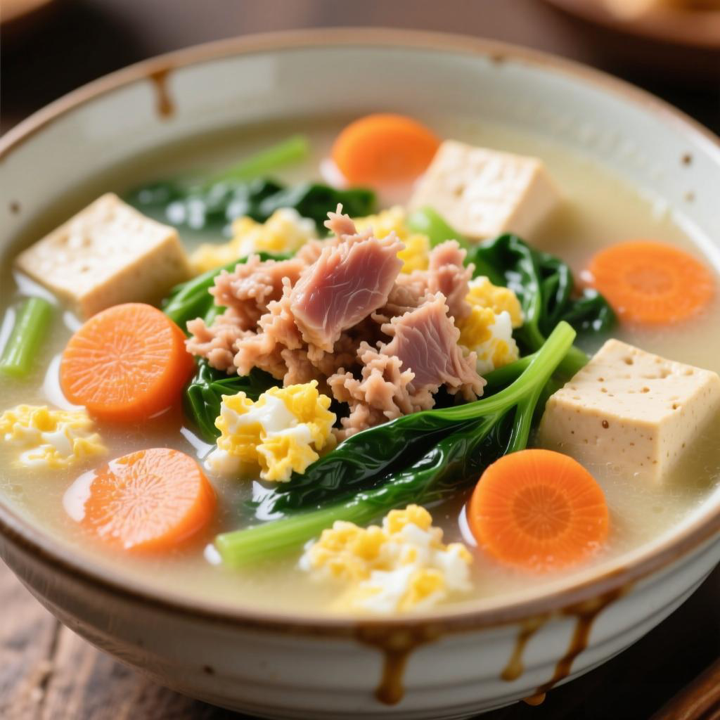 特色:口感极其软糯,无需费力咀嚼。豆腐提供优质植物蛋白和钙质,与金枪鱼搭配,氨基酸互补,营养价值更高。蔬菜羹的形式暖胃又好消化。