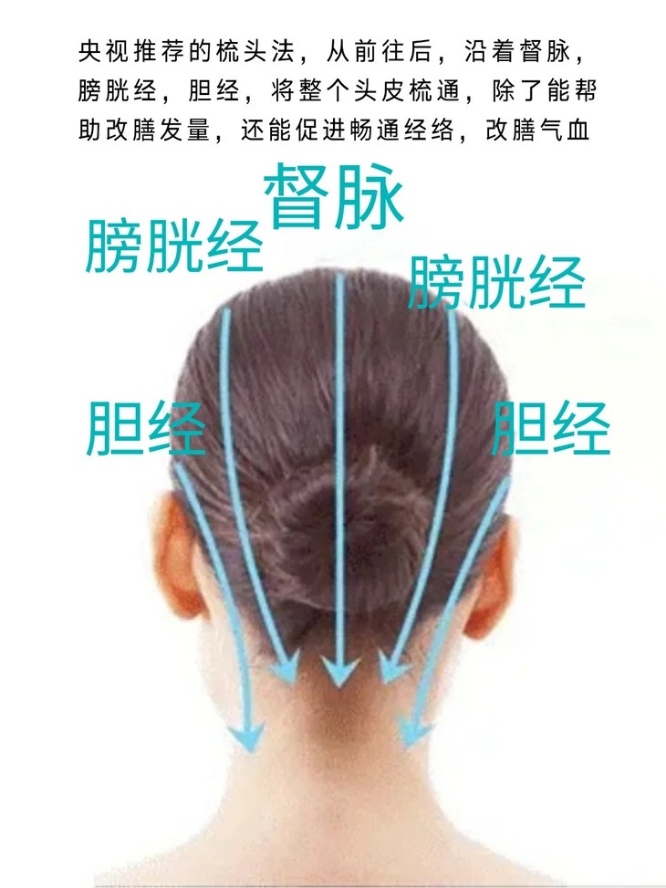 央视龚燕冰老师推荐的梳头法,从前往后,沿着督脉,膀胱经,胆经,将整个头皮梳通,除了能帮助改善发量之外,还能畅通经络,改善血气哦!