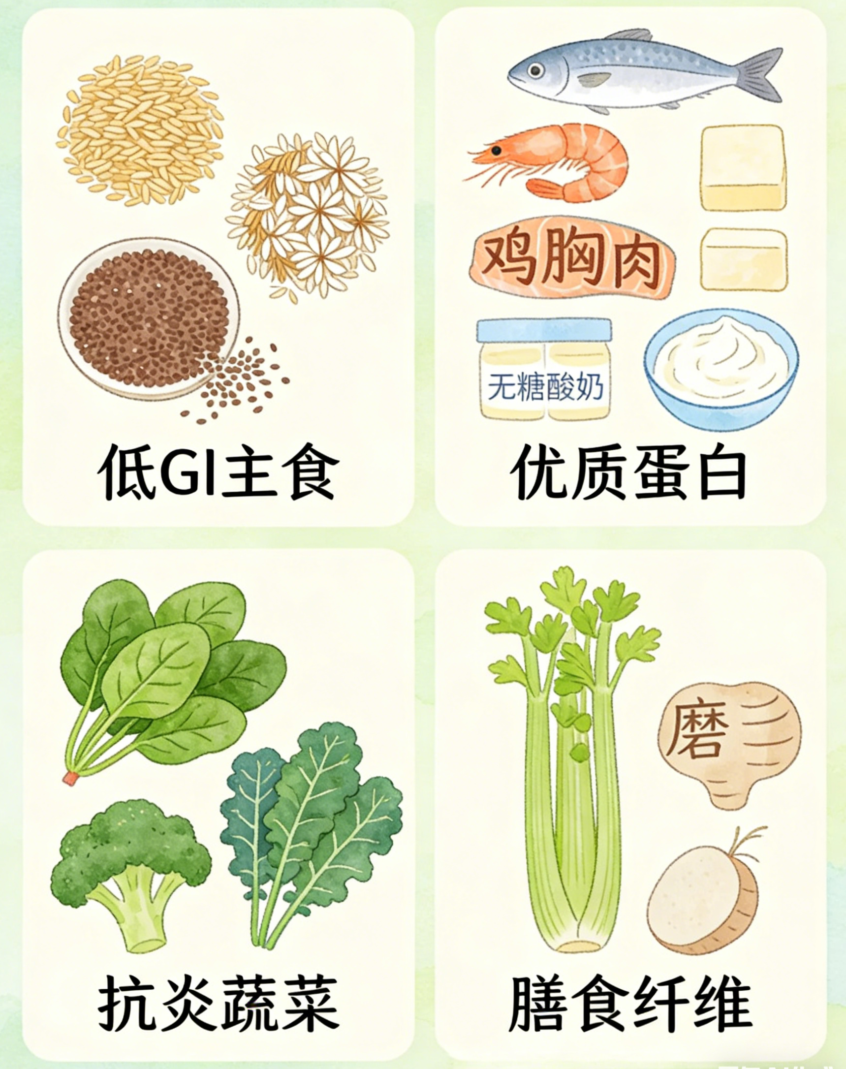 ✅ 精制碳水化合物(隐形糖化源):白米饭、白面条、白面包、馒头等,过量摄入会使血糖波动过大,比甜食更易生成AGEs,尤其晚餐过量食用,夜间代谢变慢,糖化损伤更明显——这也是很多人“不喝奶茶也黄脸”的核心原因,搭配抗糖丸时,需控制这类主食的摄入量,替换为粗粮。