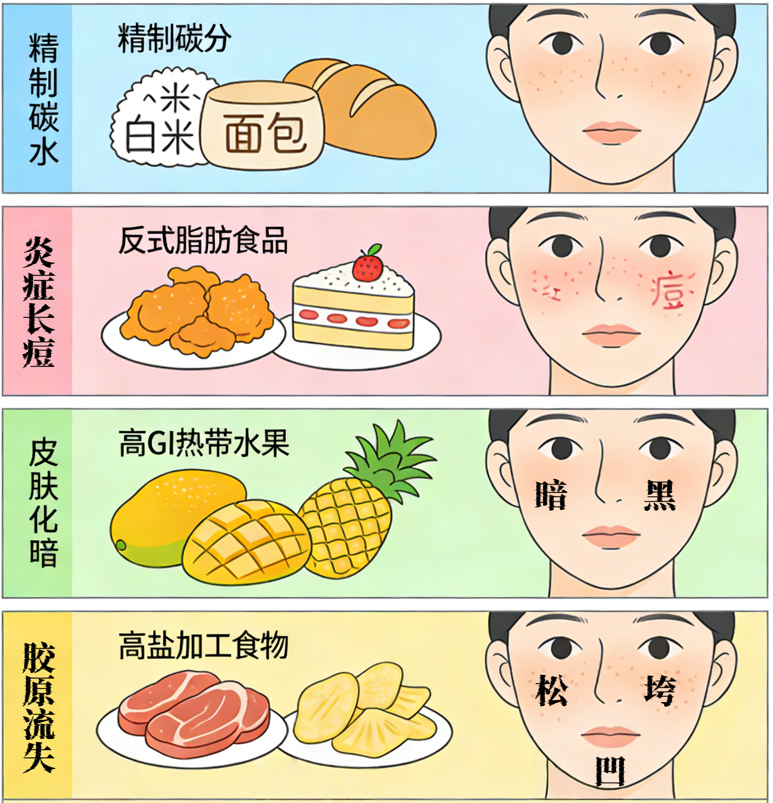 跳出“奶茶、油炸食品”的基础黑名单,重点说说容易被忽视、却严重干扰皮肤代谢的食物: