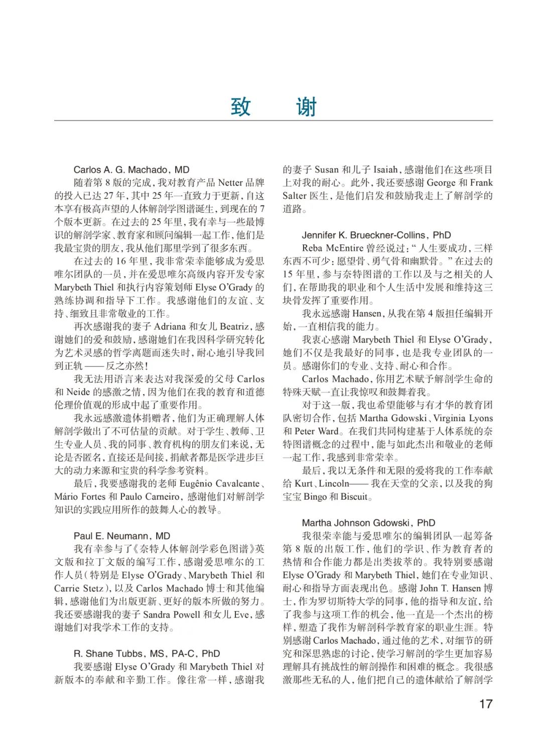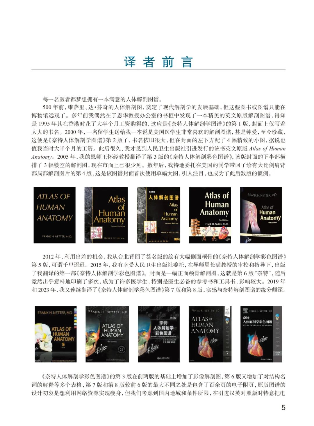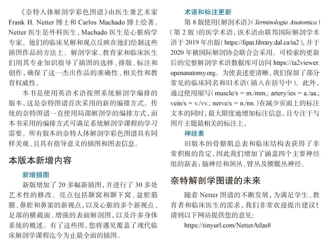 第8版英文名词接轨国际解剖协会联合会采用的《解剖术语》(Terminologia Anatomica)(第2版)中收录的医学术语,同时保留了部分常见的临床同名和旧术语,以使表述更清晰。此外,通过使用缩写减少页面上标注的文本量,同时最大限度地增加标注信息,且专注于与图片主题最相关的标注。汉英对照版在密集的信息量基础上,再次优化排版,力求呈现更好的阅读体验。
