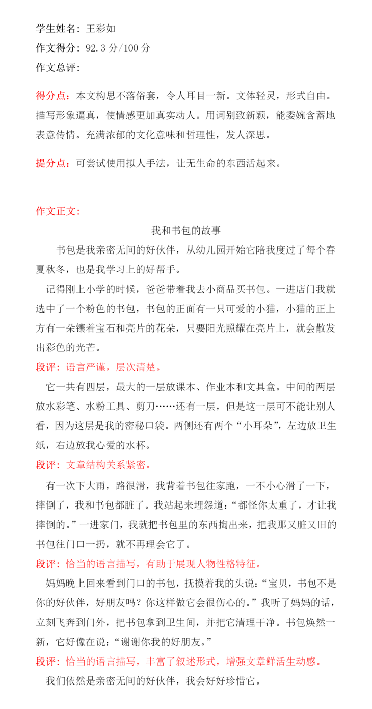 王彩如的作文自然地流露出真情实感,层次分明,条理清晰,步步深入,将自己的喜怒哀乐融入文中,平淡中见真情,文章结尾点题,值得学习!