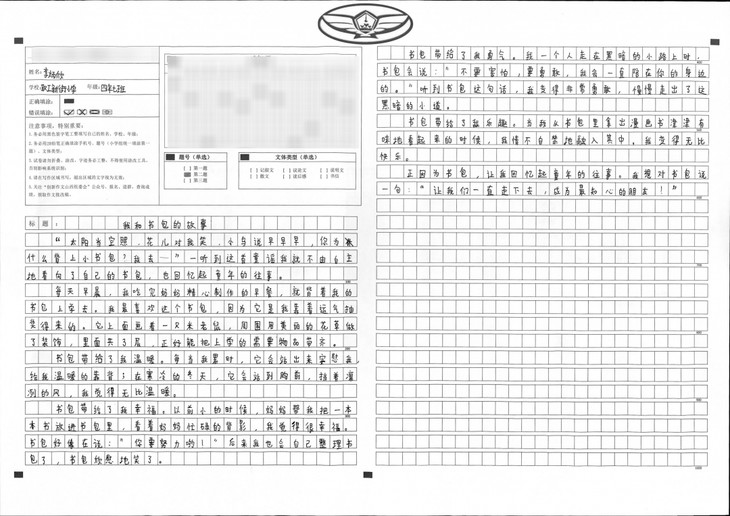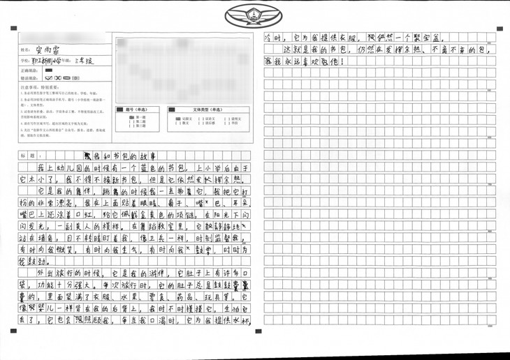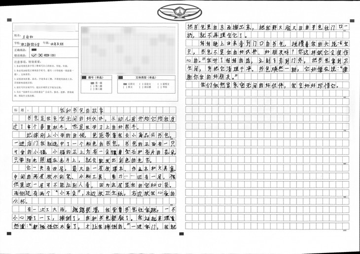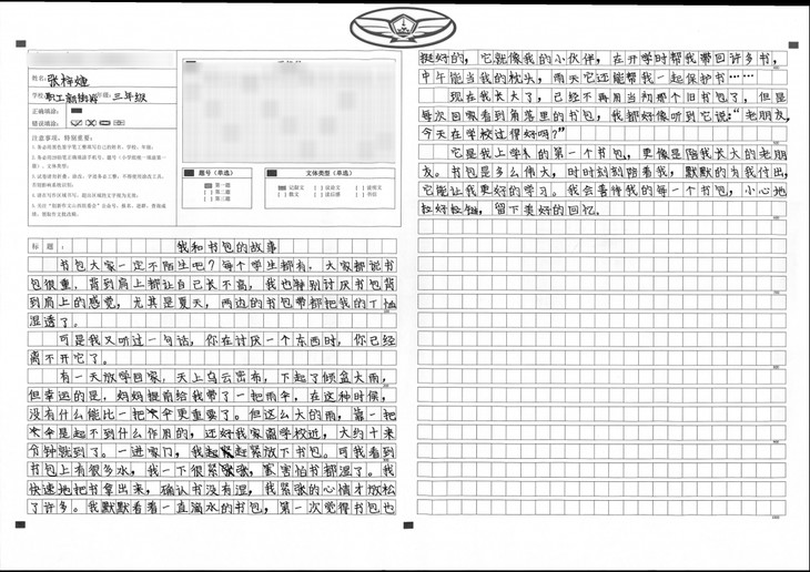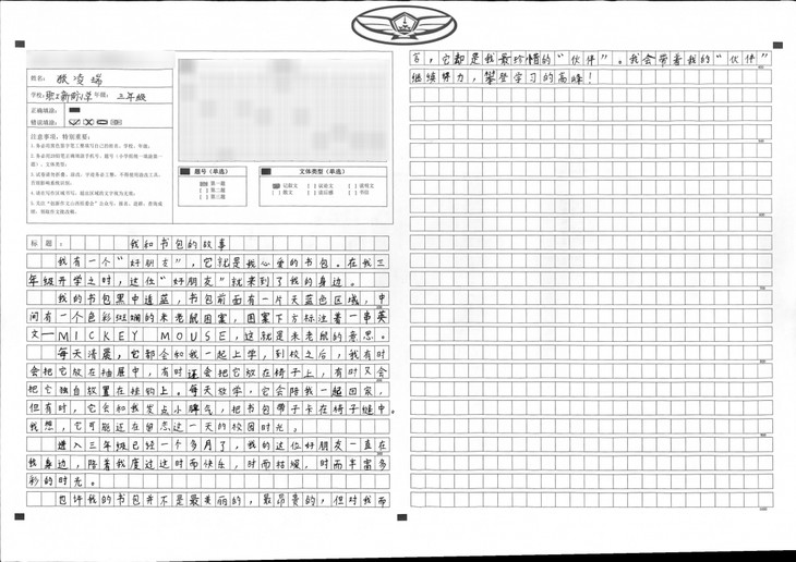 我是太原市杏花岭区职工新街小学三年三班的学生张凌瑞。我在构思《我和书包的故事》作文时,把书包想象成了一个鲜活的生命体,是每天陪伴我时间最多的一个好朋友,通过平时一些日常的小小事情,给大家呈现了一个可爱的书包小伙伴。