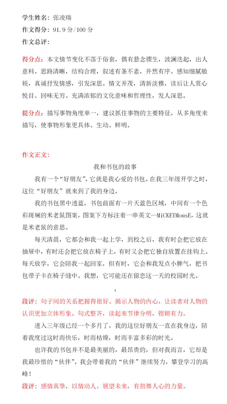 本文围绕与书包的故事展开叙述,小作者的语言十分质朴,全文如一朵清水芙蓉,淡雅朴素。“文以情动人”,正是因为小作文拥有一颗敏感、细腻、感恩的心,才能从文章中感受到奶奶的爱。字里行间流露出了你的细腻情感。文章结尾点题,有爱的书包是最珍贵的礼物,有情的文章才是好文章。这种有深度的好文章,值得我们学习!