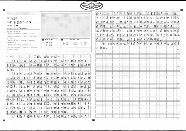 二、这是半命题作文,题目的精准定位很重要。通过引导学生把握文章主要内容指导学生将题目《你好,未来》改为《你好,未来的住行》。
