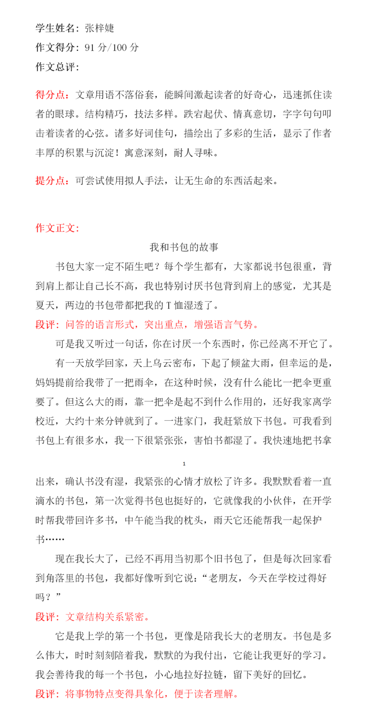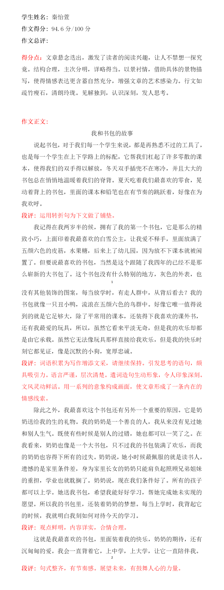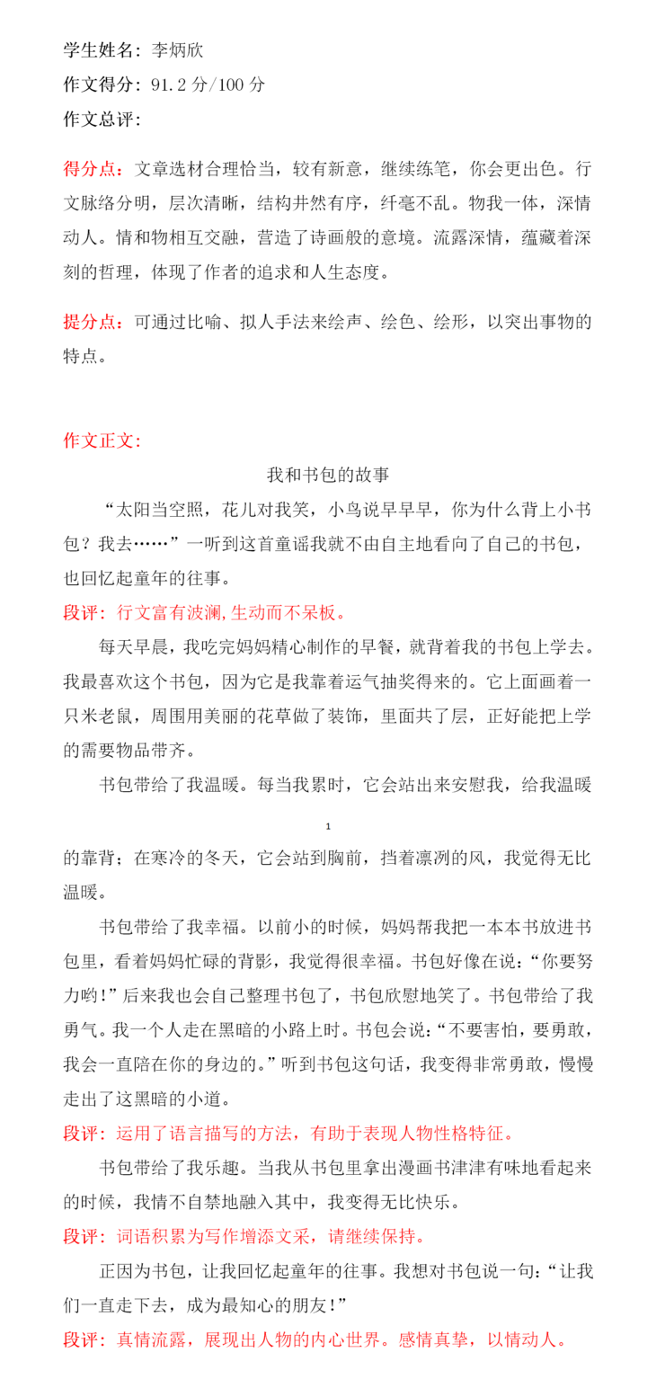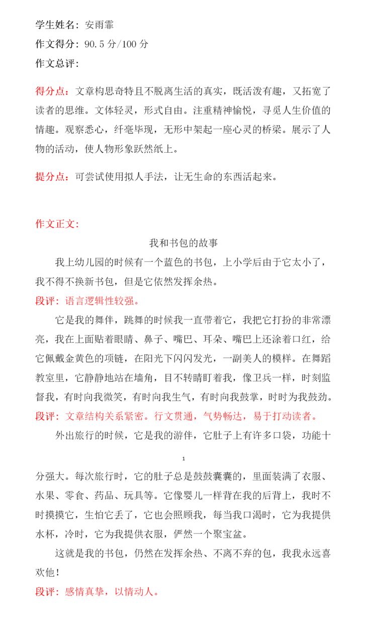 在张梓婕写作初期,鼓励她把自己的想象力和创造力尽情释放出来,让她表达自己最真实的情感,因为真实的情感最能打动人心。在写作中我帮助她推敲词语通顺句子,完成了文章。张梓婕是对生活有心的人,她爱观察周围的事物,注重积累好词佳句。《我和书包的故事》体现出她朴实自然的童心,散发出青春活泼的气息。