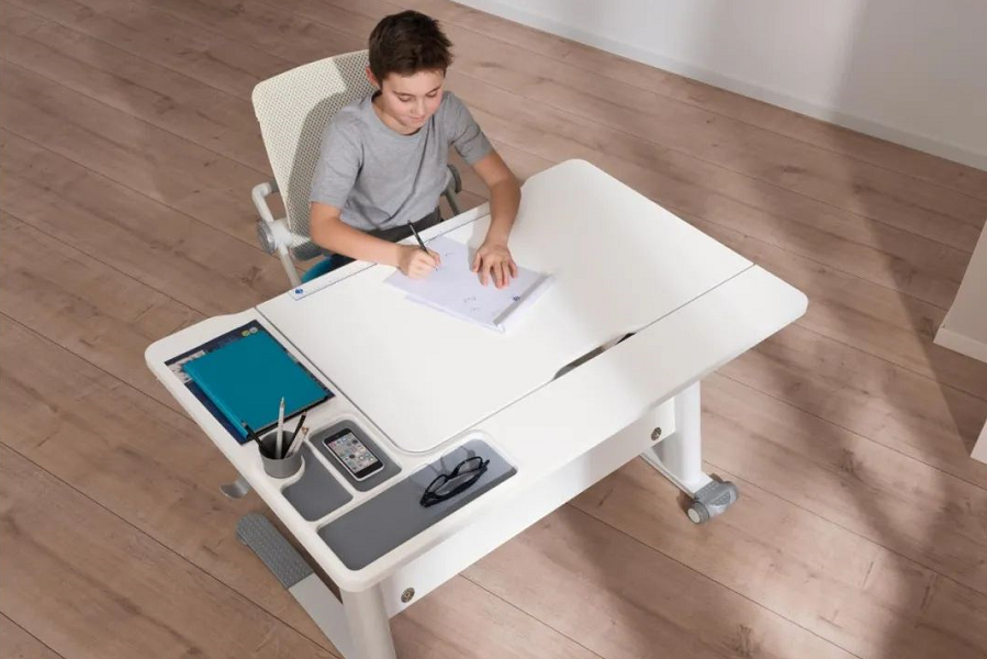 Jaro系列最突出的特点是L型的科学分区桌面,除了有一块活动的主面板之外,还有一块L型的固定区域,主面板倾斜的时候,这个区域保持水平,正前方可以放书或者网课的电脑平板,家长陪读也更舒适。