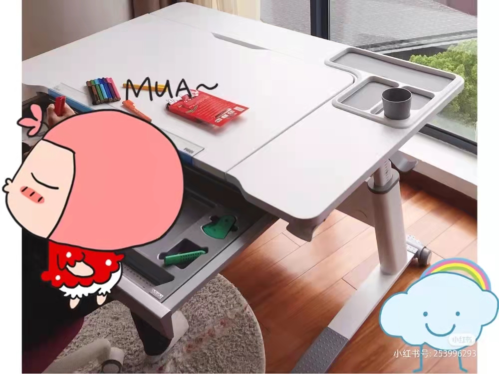 桌面设计了分区的储物槽,让孩子从小就学会分类放置自己的文具。桌腿带滑轮设计,孩子们随时可以在房间里移动~