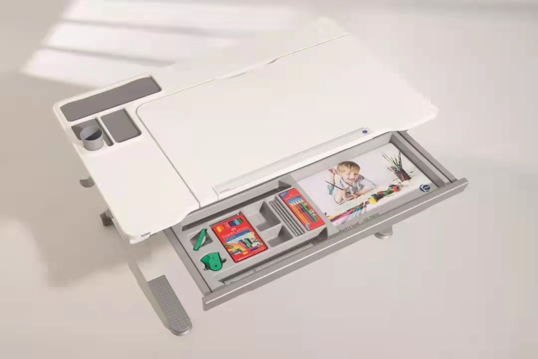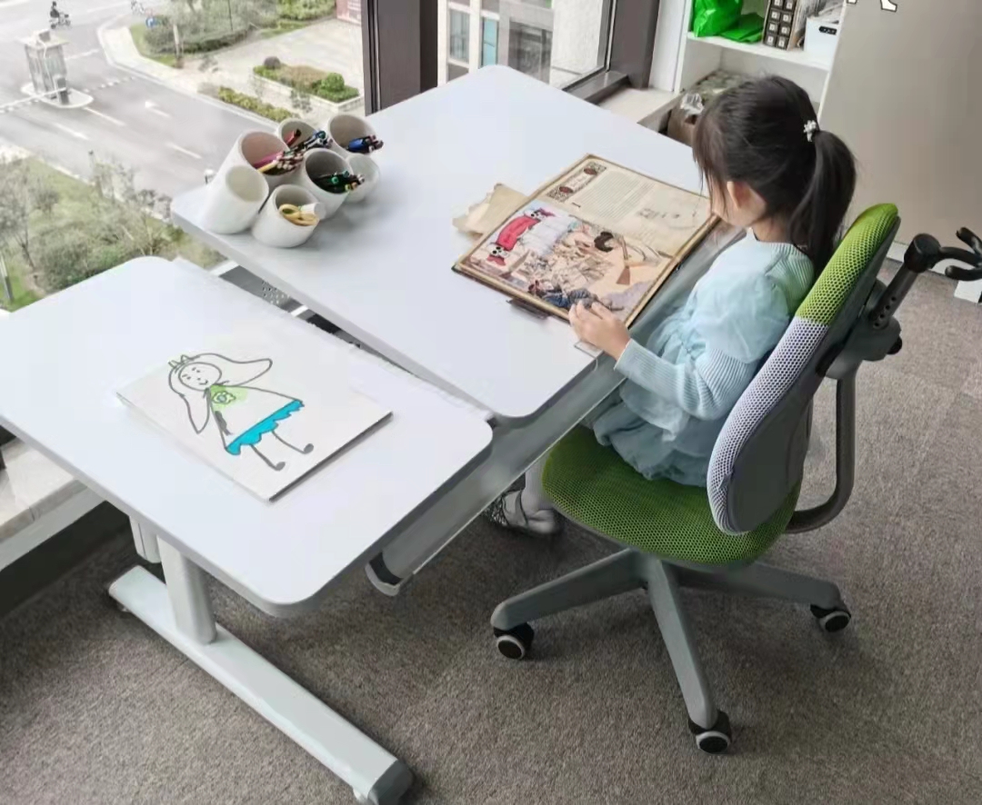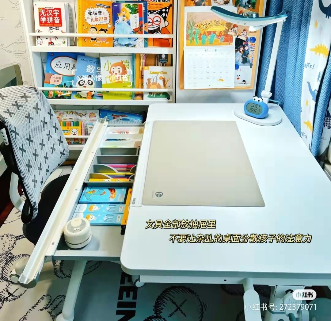 这完全根据孩子的使用习惯来。侧板上放书、文具等,大板上放此刻写的作业、画的画。这样的安排还有个好处:哪怕侧板很凌乱,孩子依然可以focus在大板的功课上,尤其是大板略微倾斜一下的话,更不可能放很多东西堆在上面。