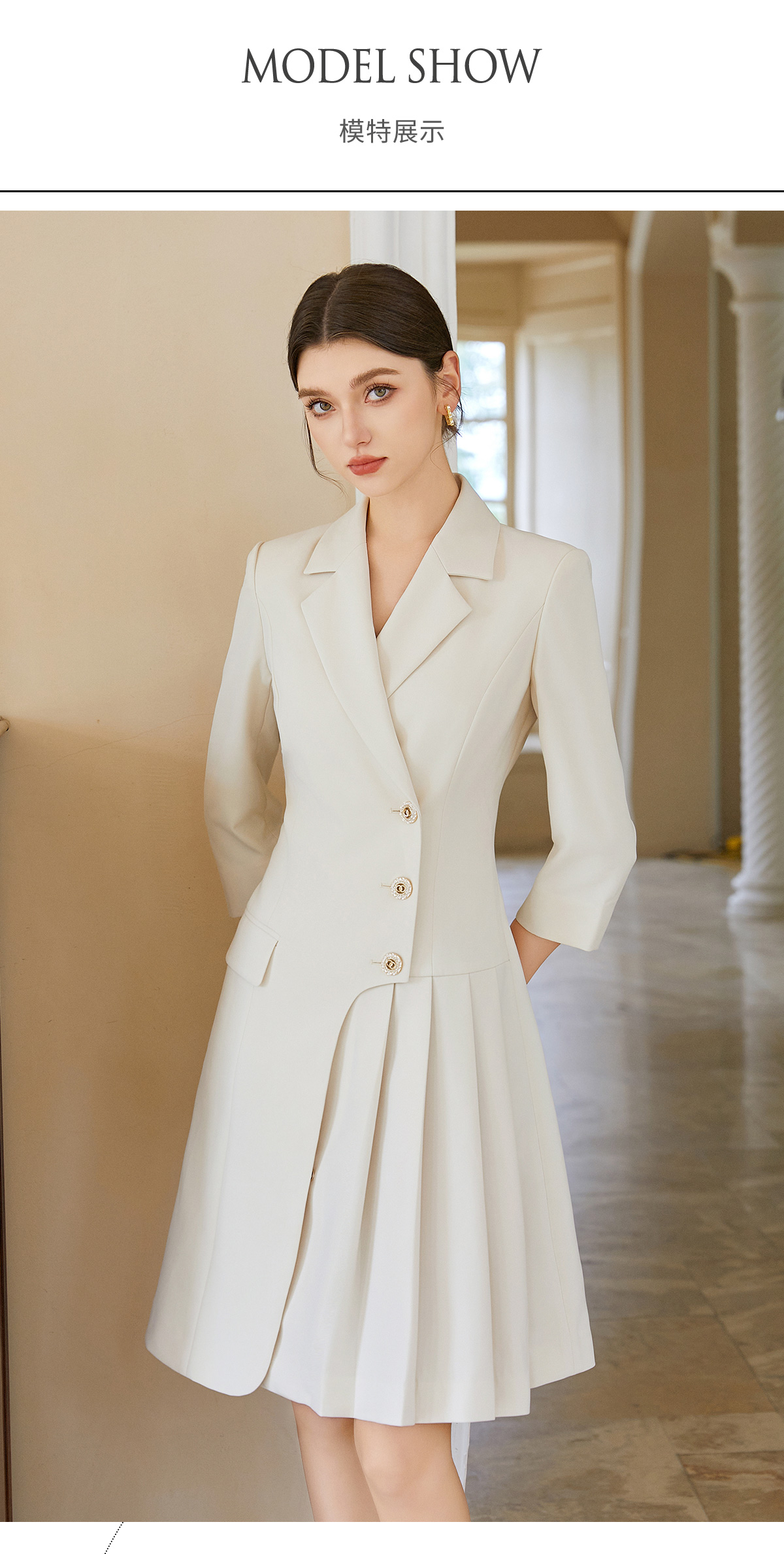 以简约剪裁,重塑职场气场。这件米白色西装连衣裙,利落翻领搭配单排扣设计,将干练与优雅完美融合,七分袖设计清爽不束缚,通勤穿搭瞬间拉满高级感。