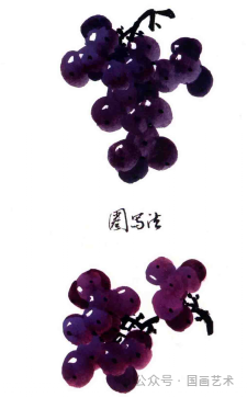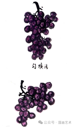 不勾葡萄的轮廓线,用笔蘸淡墨或颜色,两笔画出葡萄颗粒。↓↓↓