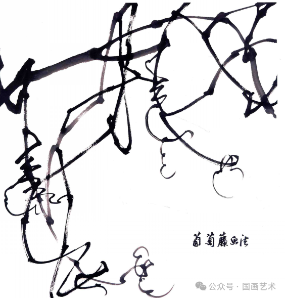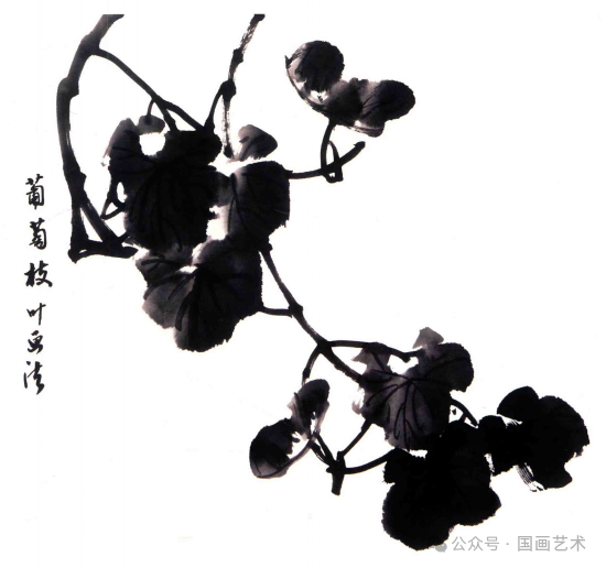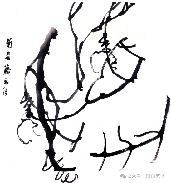 葡萄是藤科植物,藤上有节。画藤蔓如写篆字,要用中锋,用笔要有起、行、收、转、顿挫、折等变化,要表现出藤蔓的老皮粗且有皱生长,弯曲而少折的特点。藤蔓的走势穿插在很大程度上能决定一幅作品的成败。↓↓↓
