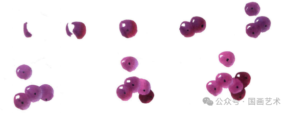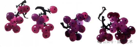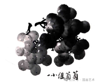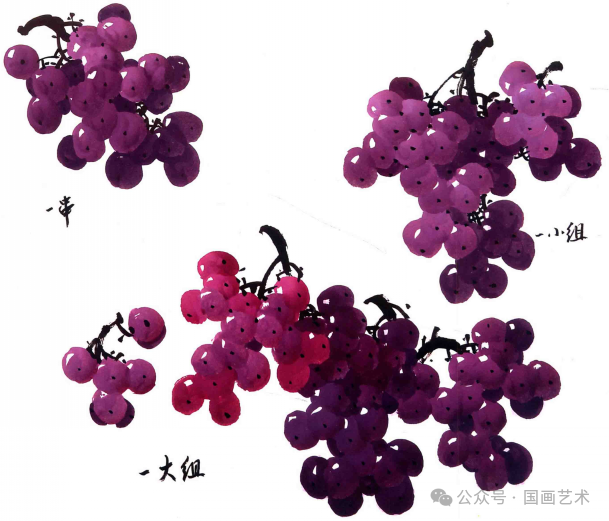 一组葡萄的画法,近似于山水画中树的画法,有“大携小”,“小扶大”之意味。不论是二串或三串葡萄的组合都要以这种形态来表现,切不可同大小。