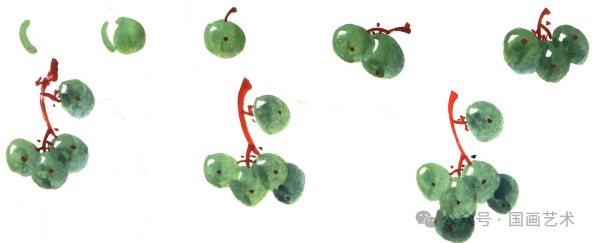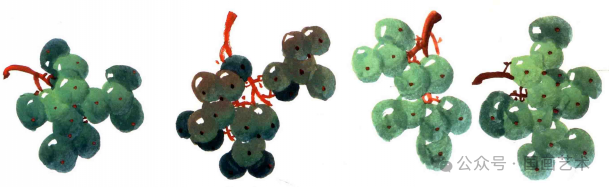 用大白云蘸饱清水调藤黄、花青,再加少许头绿配成绿色。先用笔调深色到笔根,再调浅色到笔肚。笔尖蘸一点朱磦,用前面所述紫葡萄的笔法,画出绿葡萄粒。↓↓↓