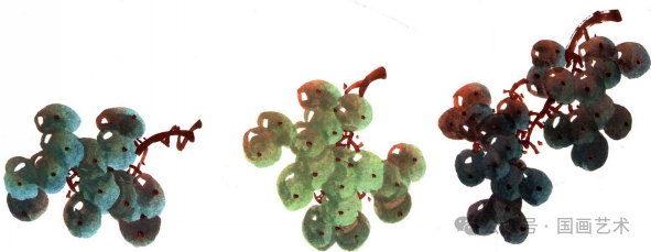 画绿葡萄要有深浅、浓淡不同,有偏黄、有偏绿、有偏青。画时淡的中问含黄的成分多,中间色的三绿成分多,深色的中间含花青和二青成分多。