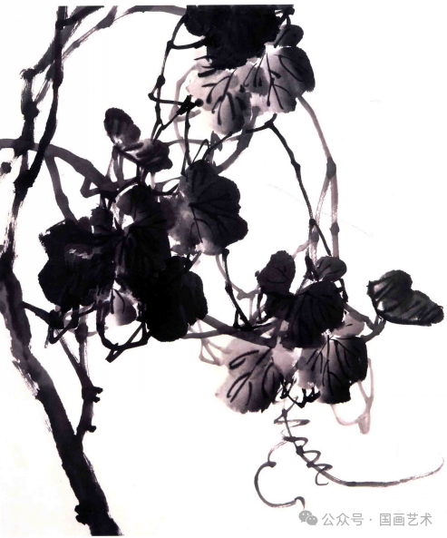 先画叶,再确定上下左右的出枝位置。画叶时侧锋下笔,用笔要果断,肯定,注意叶子的疏密关系,利用墨色的浓淡分出前后的层次。叶子画好后,按照起笔前的构思,逆锋、顺锋并用,中锋、侧锋结合穿插画出藤蔓。最后审观全面,特墨半干用焦墨勾叶筋。↓↓↓