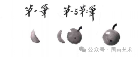 用浓墨在葡萄半干时点蒂。点蒂是画葡萄的“画龙点睛”之笔。点蒂的方向和顺序尤为重要,这需要在现实生活中多仔细观察和体会葡萄的自然形态,加以认识。↓↓↓