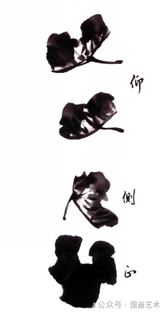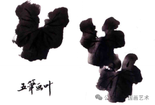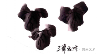 作画时选用羊毫提斗笔,先调淡墨浸全笔,然后在调色盘边沿上刮去多余的水分,再调中墨到笔肚,笔尖蘸浓墨,侧锋用笔画出叶子,这样,墨色的浓、淡、干、湿的变化跃然纸上。最后换狼毫笔重墨勾叶筋。↓↓↓