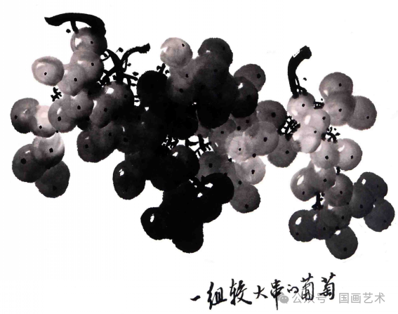 水墨葡萄是用水墨不加任何颜色来表现的。墨分五色,即焦、浓、重、淡、清。在画墨葡萄时,,注重墨色的深浅及干湿变化,要看到整串葡萄的明暗调子。葡萄形状有圆的,有长圆的,有大的,有小的。