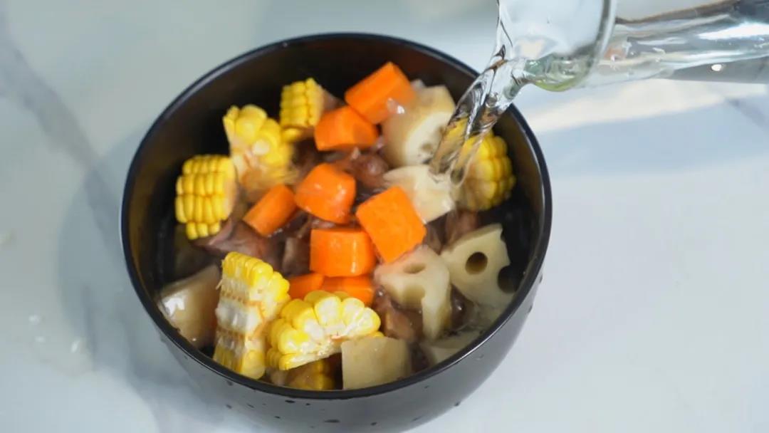 [4]加入适量清水、莲藕、胡萝卜、玉米,放入凯度蒸烤箱,使用纯蒸模式100度蒸制1小时。