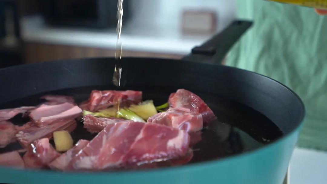 [2]洗净的排骨块冷水下锅,加入姜片、2勺料酒,烧开后煮几分钟去血沫,捞出清洗干净。