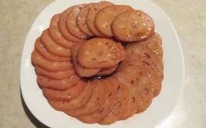 5.将熬煮好的糖浆用勺子淋在莲藕片上即大功告成了。