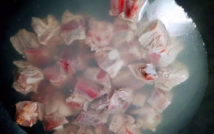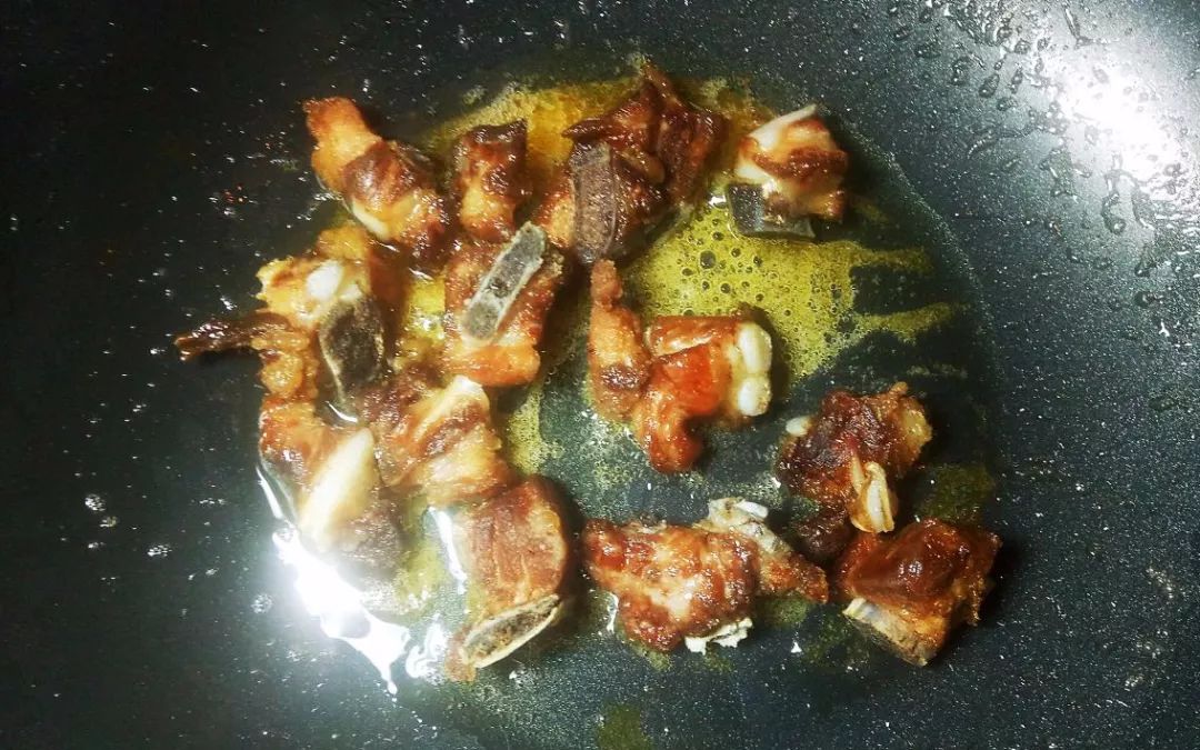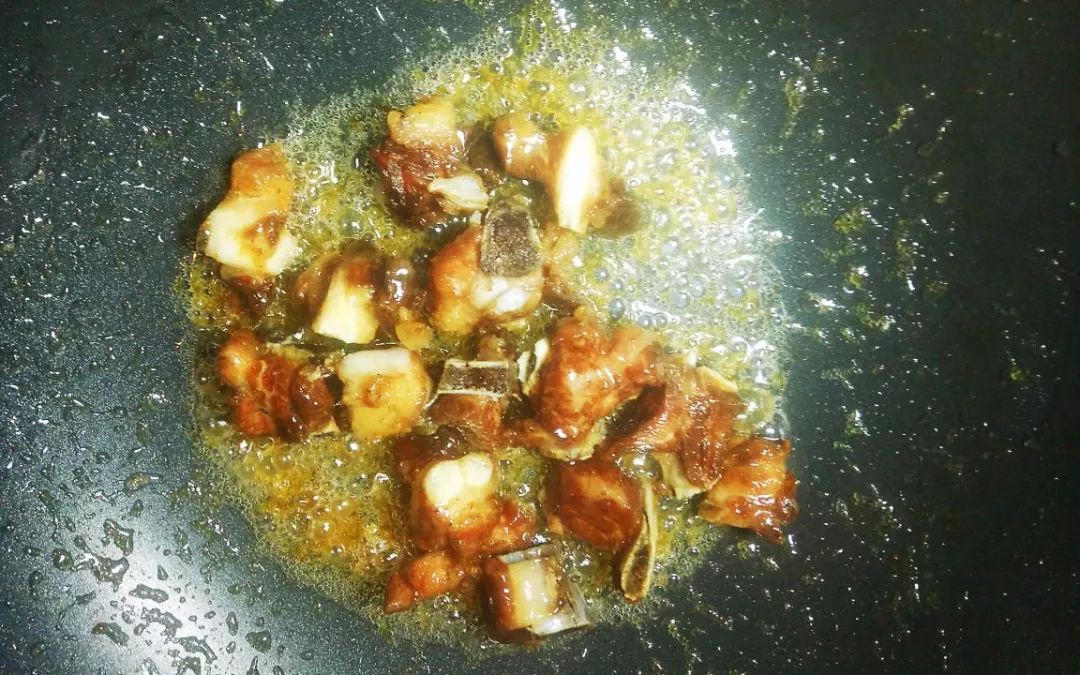 4.起泡泡了放入炸好的排骨,翻炒均匀,上色。加酱油与醋,再加适量盐和开水,盖盖子焖至收汁。