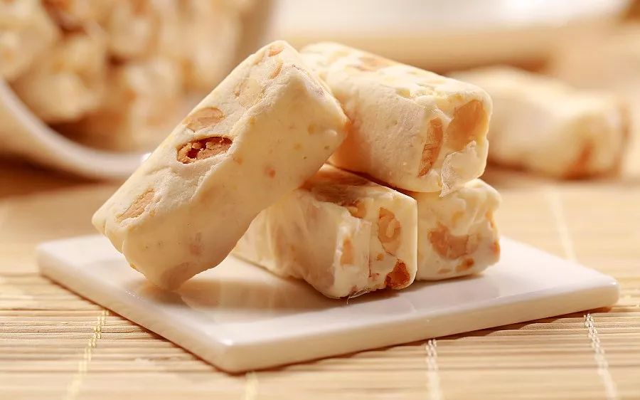 1.将花生粒放入烤箱以100℃保温备用,再将蛋白霜加入盆中打到硬性发泡备用。