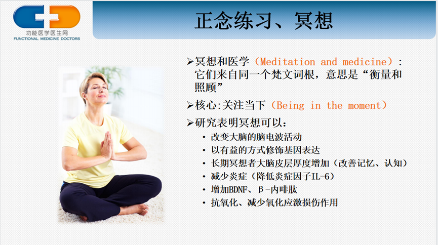 冥想的形式有多种,例如:正念、呼吸练习、祈祷、诵经、气功、瑜伽等。研究表明冥想可以改变大脑的脑电波活动,以有益的方式修饰基因表达,长期冥想者大脑皮层厚度增加,脑源性神经生长因子BDNF和β-内啡肽的产生增加,可以改善记忆、认知、减轻疼痛,还有减少炎症,抗氧化、减少氧化应激损伤作用。如果感觉压力非常大时,可以试试冥想,冥想可以帮助关闭产生压力感的交感神经系统,打开副交感神经,使身体安静下来,恢复心率、血压和正常的呼吸。