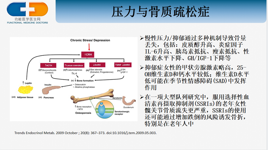 另外,研究证明抑郁症女性的甲状旁腺激素略高,25-羟基维生素D和钙水平较低;维生素D水平低反过来会影响情绪,可能在季节性情感障碍(SAD)中发挥作用;除了抑郁本身外,抗抑郁药物的使用被证明也会加重骨质的流失,特别是在老年人中会增加跌倒风险诱发骨折。