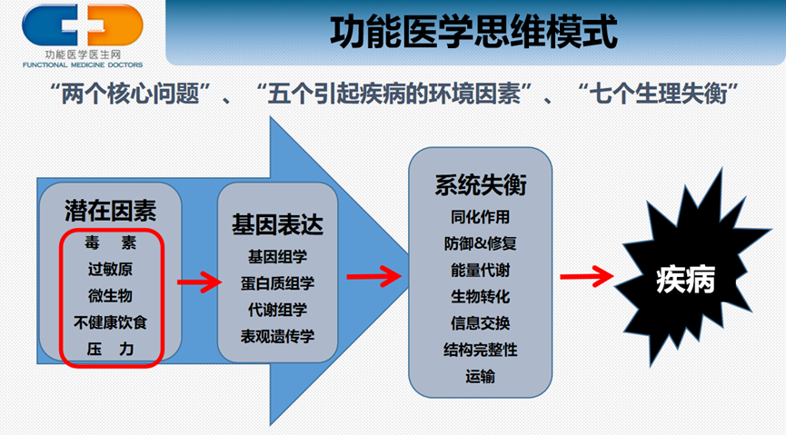 首先,功能医学认为引起疾病发生的两个核心问题是“该有的不足,而不该有的太多”;疾病是基因和环境共同作用的结果,每个个体先天基因的序列目前虽然没有办法改变,但是当前的研究发现基因的表达可以通过营养、环境因素来调控,通过好的生活方式、补充某些营养来关闭坏的基因,从而不生病、少生病、不生大病。因此功能医学研究的重点就是找到导致每个个体发生疾病的潜在因素,纠正生理失衡,最后达到恢复健康的目的。导致疾病的潜在因素归纳起来主要有5个,包括:毒素、过敏原、微生物、不健康的饮食和压力。本期文章将重点讨论压力如何通过影响7大系统的生理失衡、最终导致疾病。
