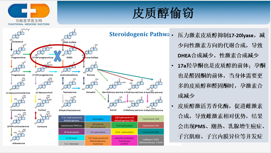 第三级(与生殖相关):卵巢、睾丸;当生命受到危险的时候,机体优先供给和保护第一级别的内分泌腺体;第三级别的腺体最先被牺牲。所以在临床上经常看到长期压力大的女性患者,最先出现的健康问题就是月经紊乱。因为压力大时身体需要合成更多的压力激素皮质醇,皮质醇会抑制性激素合成途径中17-20裂解酶,导致向性激素方向的合成代谢减少,性激素合成减少。另外皮质醇还会激活芳香化酶,促进雄激素向雌激素的转化,导致雌激素相对优势,许多女性的经前期综合征、痛经、潮热、乳腺增生、乳腺癌、子宫肌瘤、子宫内膜异位症和压力导致的荷尔蒙失衡也是密切相关的。