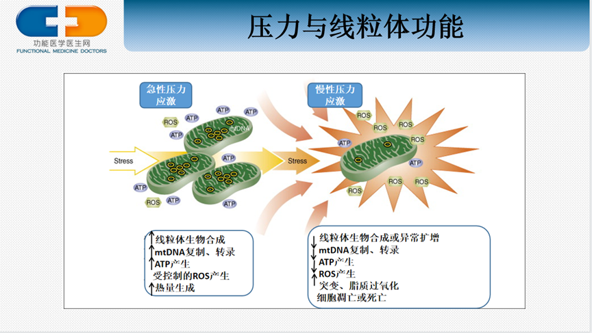 急性压力发生时,线粒体能量代谢增强,线粒体生物合成增加,DNA复制转录增加,ATP、热量生成增加,而且活性氧(ROS)的生成受控制,帮助人体应对压力、渡过危险。但是,现代社会人群面临的往往是慢性压力,而慢性压力会抑制线粒体DNA的复制转录,降低线粒体的生物合成,降低ATP的合成,还会导致ROS过度产生,导致线粒体DNA突变,脂质过氧化,最终还会导致整个细胞的凋亡或死亡。