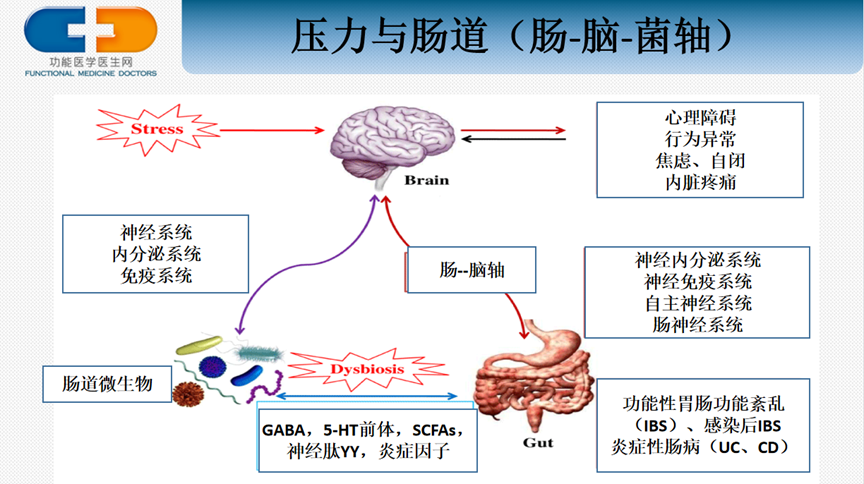 肠道被称为人体的第二大脑,含有丰富的神经系统和神经细胞,分泌多种神经递质,肠道和大脑之间可以通过多种方式相互交流、相互影响。大脑感受压力的信息可以瞬间传递到肠道,引起胃肠功能的紊乱和肠道菌群的失衡,而肠道微生态的失衡会继发神经递质的改变,例如:血清素、GABA、SCFAs,神经肽YY,促炎因子等,这些神经递质、炎症因子又进一步激发压力应激反应,形成恶性循环。因此压力大时,需要格外注意照顾肠胃。此时不能以肥甘厚味、辛辣刺激来激发食欲,因为压力会抑制消化酶的分泌,损伤胃肠道黏膜,此时的饮食要以清淡为主、追求营养密度高,否则会进一步加重胃肠的负担。