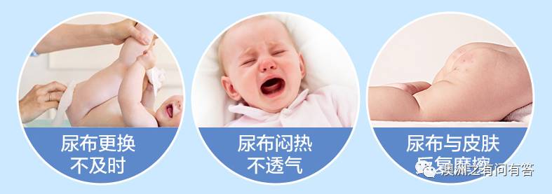 尿布疹的主要表现是尿布包裹的位置的皮肤发红,刚开始时,仅在每侧臀部中心处发现两块“胭脂样”的红晕,继而出现丘疹、脱屑或小水疱,厉害时会有脓疱、破皮及溃疡,同时也会逐渐蔓延到大腿内侧、会阴等处。
