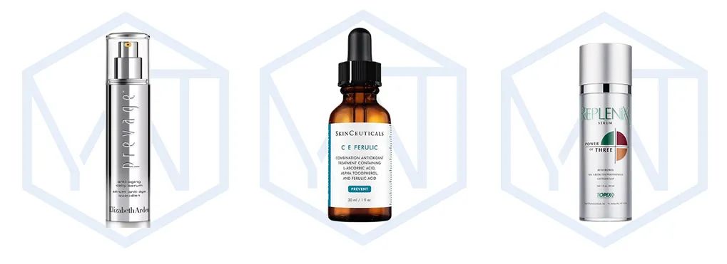 雅顿橘灿精华(艾地苯);修丽可CE精华(15%维C+1%维E+0.5%阿魏酸);Topix三重抗氧化精华(绿茶多酚+白藜芦醇+咖啡因)。