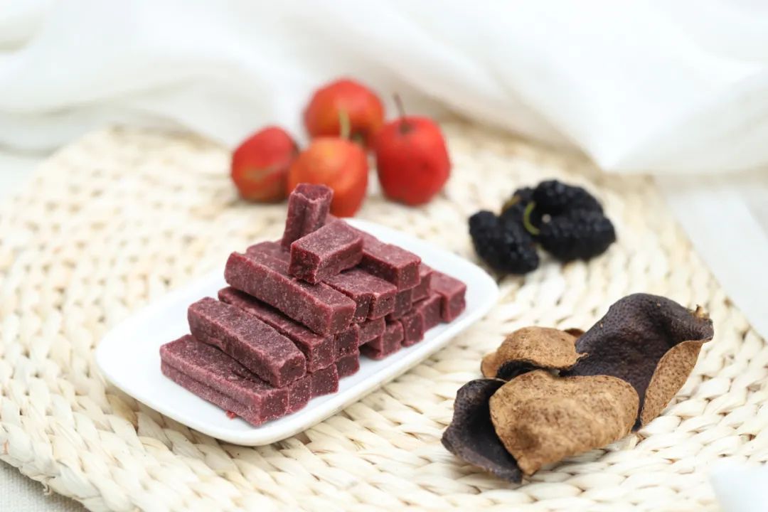 市面上一般是单一口味的山楂条。这款陈皮桑椹山楂条,味道上来讲更加丰富。