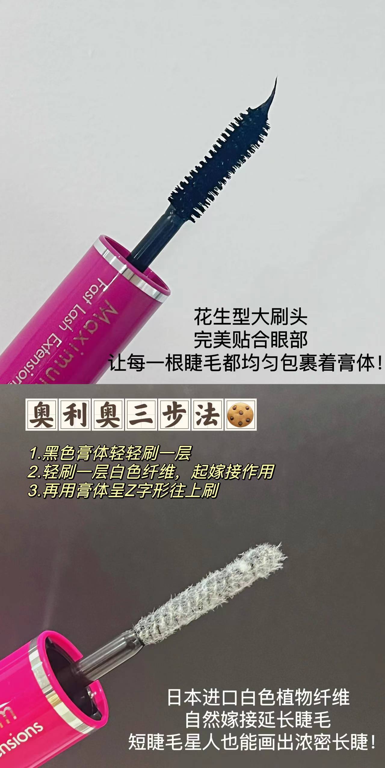 白色的毛毛是日本进口植物纤维,可以嫁接增长本身的睫毛。(⚠ 只要涂在眼尾部分就好了,不用涂满整个睫毛喔~)