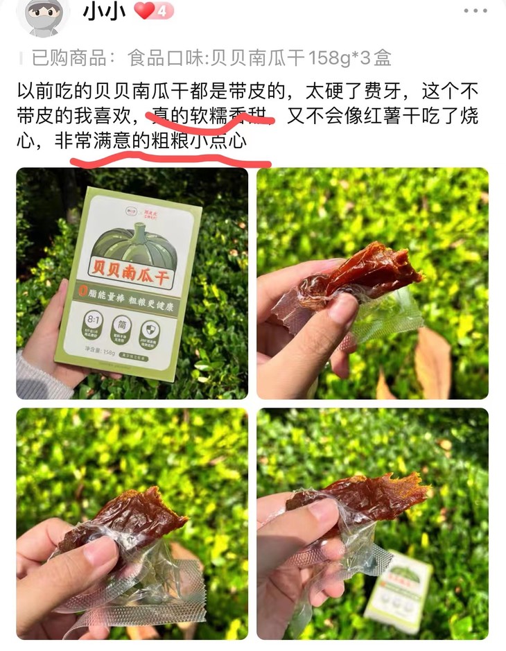 每块都是独立真空包装,方便携带,小饿小馋随时来一根,不粘手。味道好极了,每一块南瓜干都带着肉感,健康的小零食谁不爱呢!大家吃过之后也都是好评连连~