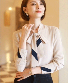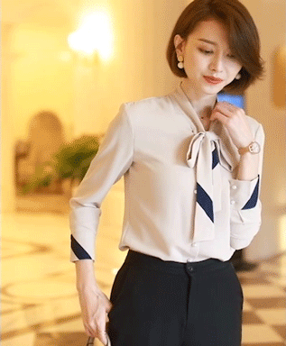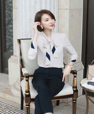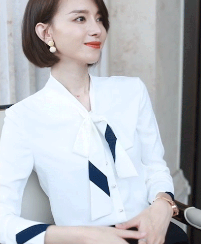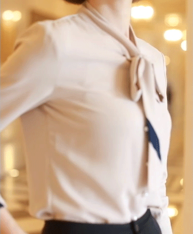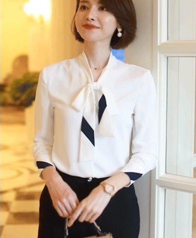 领口上的丝巾系成蝴蝶结,简约而不单调。