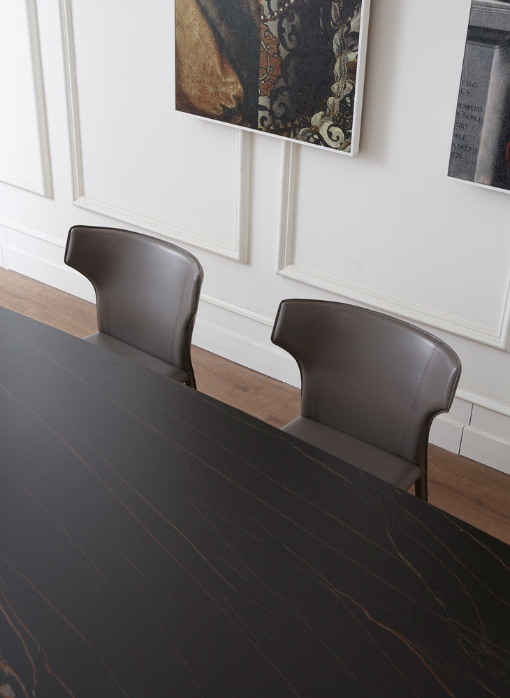 今天安利的Rome岩板餐桌气场十足,自带高级感。桌面精选意大利进口岩板,纹理自然流畅,耐磨实用。2.6米超宽大尺寸满足多人就餐需求,圆润的弧线设计更为柔和安全。设计感超强的柱形底座展现迷人的金属光泽,将极简美学与功能融合。深灰色马鞍椅餐椅,包裹式靠背,优雅倚靠更舒适。