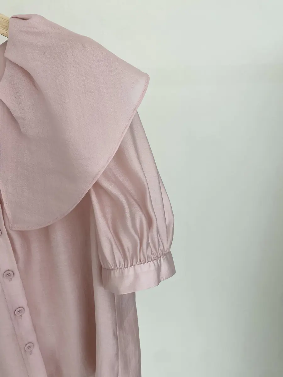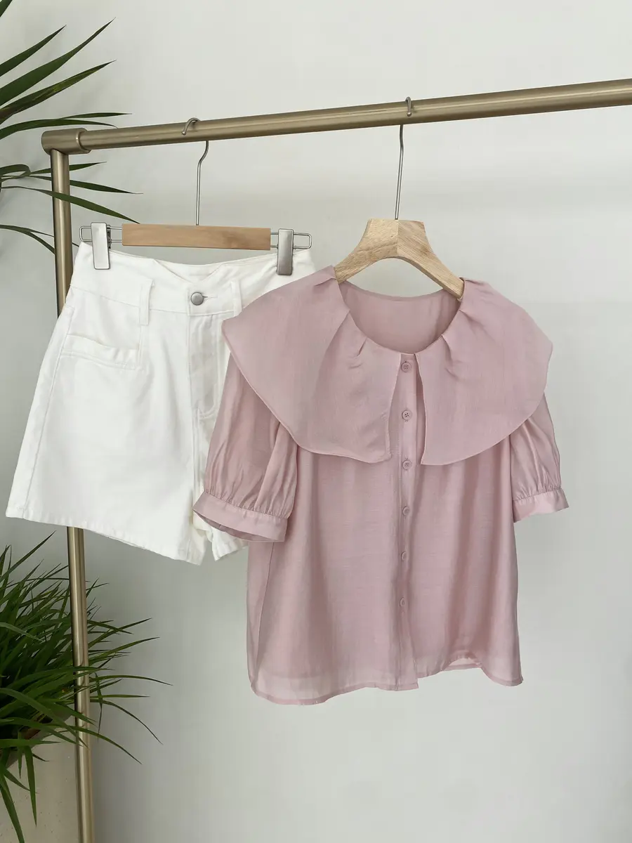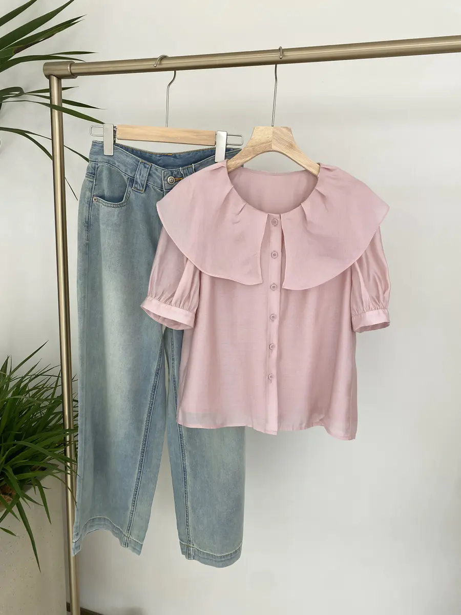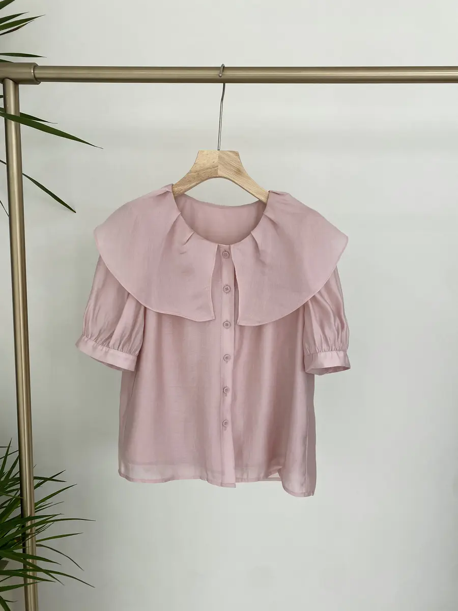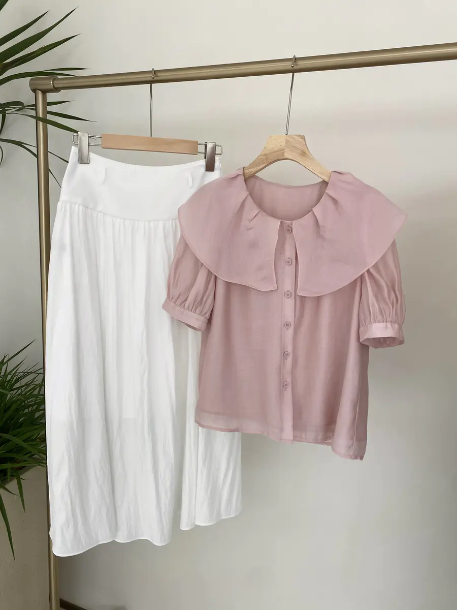 韩系公主风小衫,运用大荷叶边领打造浪漫感,袖子则采用泡泡袖设计,更增加甜美感