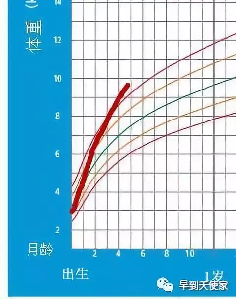 大家再看这个图,一个涨势喜人的图。体重一路上涨最后突破了第97百分位。成为了一个小胖子。大家可以看这个图这条线属于一路上涨的状态,虽然也在随着曲线的变化有那么一点变化,但是依然是在快速上涨。那么很有可能就是家长没有给孩子极早的停止使用母乳强化剂或早产儿奶粉导致的,孩子每天补充的能量过多最后属于超负载的生长。这种情况一般就是家长对于喂养知识知道的比较少,然后盲目追求体重所导致的。最后很容易让孩子患上肥胖症高血压等疾病。那么如果家长并没有给孩子过多的添加强化剂或者是早产儿奶粉,只是单纯的母乳喂养或者是普通奶粉喂养,但是呢孩子的体重依然是突破了第97百分位,那么我给家长的建议就是带着孩子去医院做一下内分泌方面的检查,来确看一下孩子在疾病方面有没有什么问题发生。
