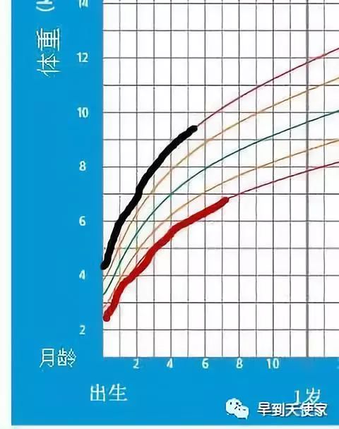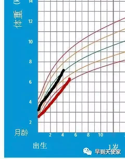 然后我们现在来看这个第四张图,这是一个儿童生长发育曲线图,那个图也挺大的,我把她截图截到了0-一岁的一个小图,看起来方便一点。然后我在这个图上画了两条线,我们先看红色的线,红色的线大部分处于第三百分位下面生长势头不错,对吧,这个就是很多早产儿会出现的一种线,因为很多医院做评估的话一般都是用这种儿童的生长曲线图,然后咱们的孩子因为早产,所以在前期体重肯定会比足月儿要低,而这个线是按照出生月龄来的,所以很容易出现这种红线在第三百分位下面。但是如果我们的孩子按照矫正月龄来测的话其实有可能是在黑线的这种状态上,那么看黑线的话体重增长还是不错的。所以首先遇到这种情况我们家长先不要担忧,因为我们的孩子是早产所以需要追赶生长一段时间,哪怕体重暂时没有到达一个理想的目标,没有达到普通足月儿出生的正常状态,但是只要孩子追赶的势头不错,那我们也应该给孩子一点时间,继续追赶不要着急。
