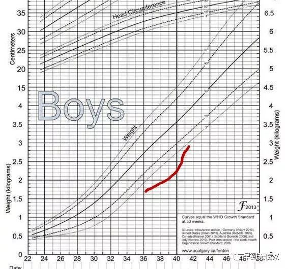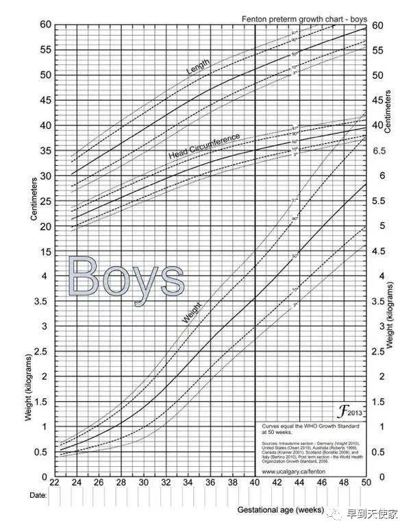 然后我们今天主要针对早产儿来聊一聊他们的一个体重发展的不同情况。所以我把芬顿曲线的体重部分给截了下来,方便大家观看,我们今天主讲的就是男孩的图,男孩女孩其实意思是一样的图上的曲线也都基本差不多,没有必要两种都讲,就讲一种就可以,大家明白了怎么用就可以了。