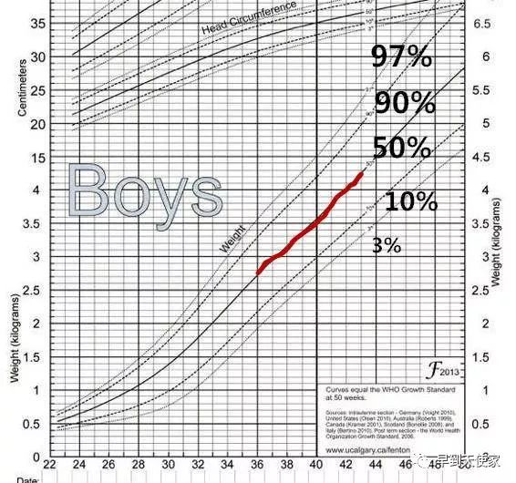芬顿曲线图就是上面这两个大家可以看到,横坐标指的是孕周,从22周到50周,纵坐标指的是身高体重和头围。图上不管是身高体重还是头围都有五条线从上到下指的是第97、90、50、10、3百分位。什么意思呢,比方说第50百分位体重线来说,很好理解,100个相同月份的孩子里面体重排在第50的小孩,肯定就是一个中等的水平,所以第50百分位应该是大家比较追求的一个状态,不高不矮不胖不瘦身材匀称。剩下的第97第90就属于比较胖的孩子,第10、第3就属于比较瘦的孩子。但是我们要知道的是,不管是第97百分位的孩子还是第3百分位的孩子家长都不要太多过于担心,这都是属于一个正常的范围内,这就相当于一个班级一样,里面必须要有高矮胖瘦之分对吧,不可能都是标准的一水的男模特女模特,都是这样的那得是什么班啊,北京电影学院的吗,是吧。
