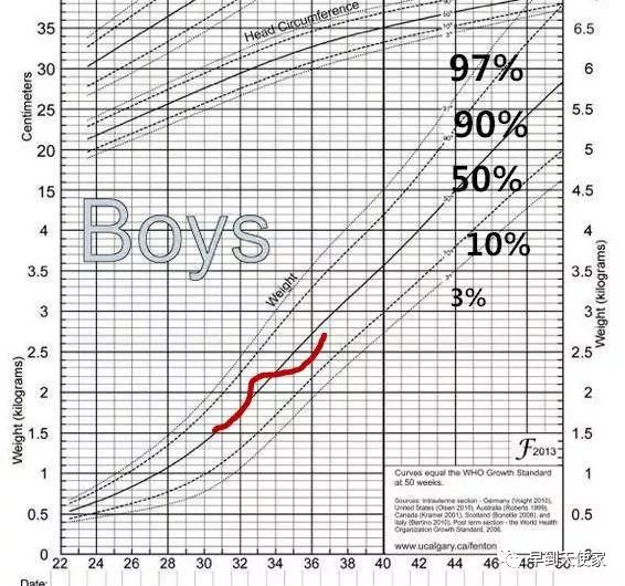 我们再来看这个图,这个孩子从出生的纵坐标开始刚刚过了第三百分位,虽然属于体重还是有点偏低,但是体重增长的还不错,然后到了马上要到第50百分位的时候体重开始平缓了。这个是为什么呢?孩子出现体重增长缓慢的话一个是有可能出现生病的情况,还有一个就是孩子的营养不足导致的。首先我们要排除孩子生病的一个因素,孩子生病出现体重不涨比较常见。那么如果不是孩子生病呢?那就是孩子营养不足以支持他他体重再快速增长了。那么对于早产宝宝来说出现这个情况很有可能就是母乳强化剂或者是早产儿奶粉停掉了导致的。这个也是比较常见的一种情况,孩子的体重增长追上了足月儿体重的第25百分位上,然后开始慢慢停掉了母乳强化剂或者是早产奶粉换上了普通奶粉。然后孩子的体重增长的趋势发生了改变。所以我们在给孩子停止使用母乳强化剂或者由早产奶粉呢更换成普通奶粉时要循序渐进,不能一次性更换,最好是咨询过医生以后再做决定。