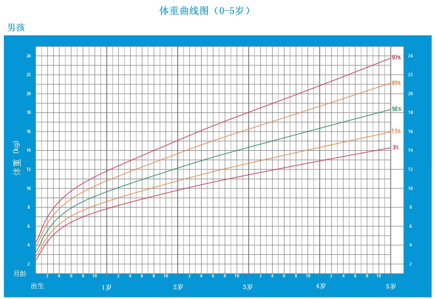 上面我又发了两张图,指的是儿童生长发育曲线。然后横坐标指的是月份,纵坐标指的是体重。上面的五条线分别指第3、15、50、85、97百分位,意思其实和上面的芬顿曲线是一样的。第三百分位的孩子就属于偏瘦的,97百分位的就属于偏胖的。
