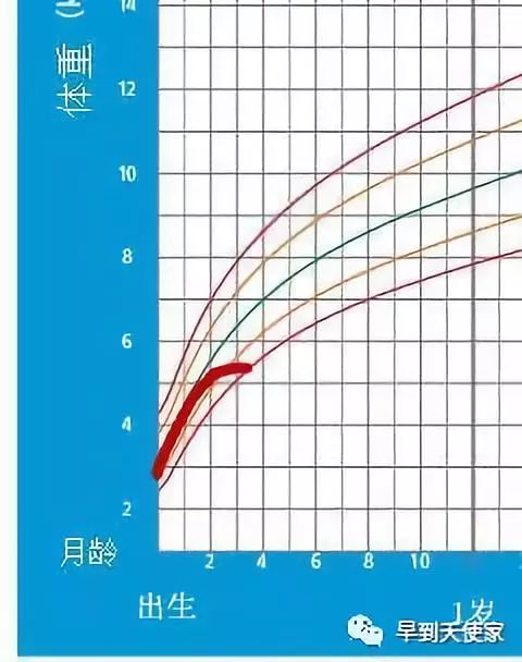 我们再来看这张图,和上一张不一样的地方就是到了6月份以后孩子的体重平缓以后并没有上涨。说明孩子的营养跟不上了。那么原因就有可能是在孩子6个月左后的时候需要添加辅食了而家长呢并有给添加,还是吃母乳或者吃奶粉,这个时候的母乳喝奶粉已经不能满足孩子的生长需要了。还有一种可能就是孩子不爱吃辅食,导致体重增长缓慢,所以作为家长呢我们要善于引导孩子辅食的添加,有耐心的引导孩子去接受这些固体食物。