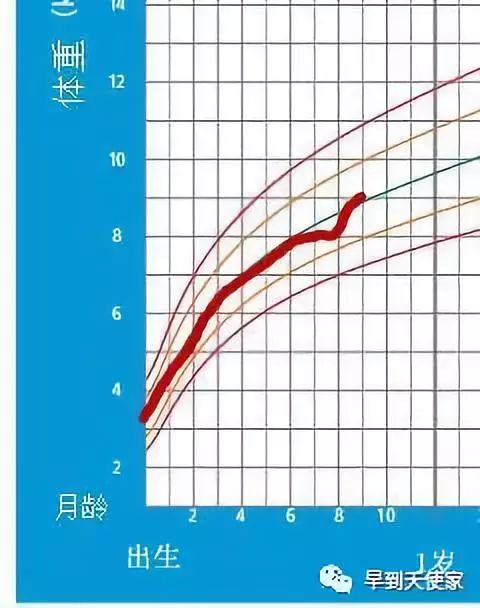 我们再看一下第八张图,这个图是比较常见的一个图,就是说孩子本来体重增长的挺好的突然停了一下打了个弯就又回到了原来的状态。这个是怎么回事呢?其实出现这种情况的原因比较多,有可能是孩子生病导致的,也有可能是换环境了,搬家了孩子不太适应。也有可能是更换了孩子的看护人员,以前是妈妈看孩子后来妈妈上班去了改成奶奶看孩子了,前两个星期看孩子看的不顺手导致孩子体重增长缓慢。还有一个就是大家看我发的图是孩子在6月份开始出现的增长缓慢,那这个就很有可能是因为孩子开始添加辅食了,可能还有一些不适应,导致体重增长缓慢了这么一段时间,但是一旦宝宝或者家长找到了规律或者适应了这个改变的过程,孩子的体重就会又上升了。所以家长们也不用太担心。
